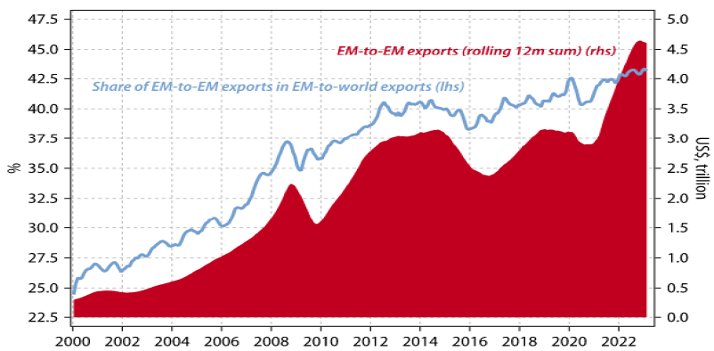 Probably the most important geopolitical event of 2023 is the restart of diplomatic relations between Iran and Saudi Arabia. The peace dividend in the Gulf area could also lead to a diminished allocation to USD reserves as the capital-intensive needs in military spending, directed to the US should abate (considering as well the transition from expensive military jets towards drones’ cheaper technology broadening utilization).