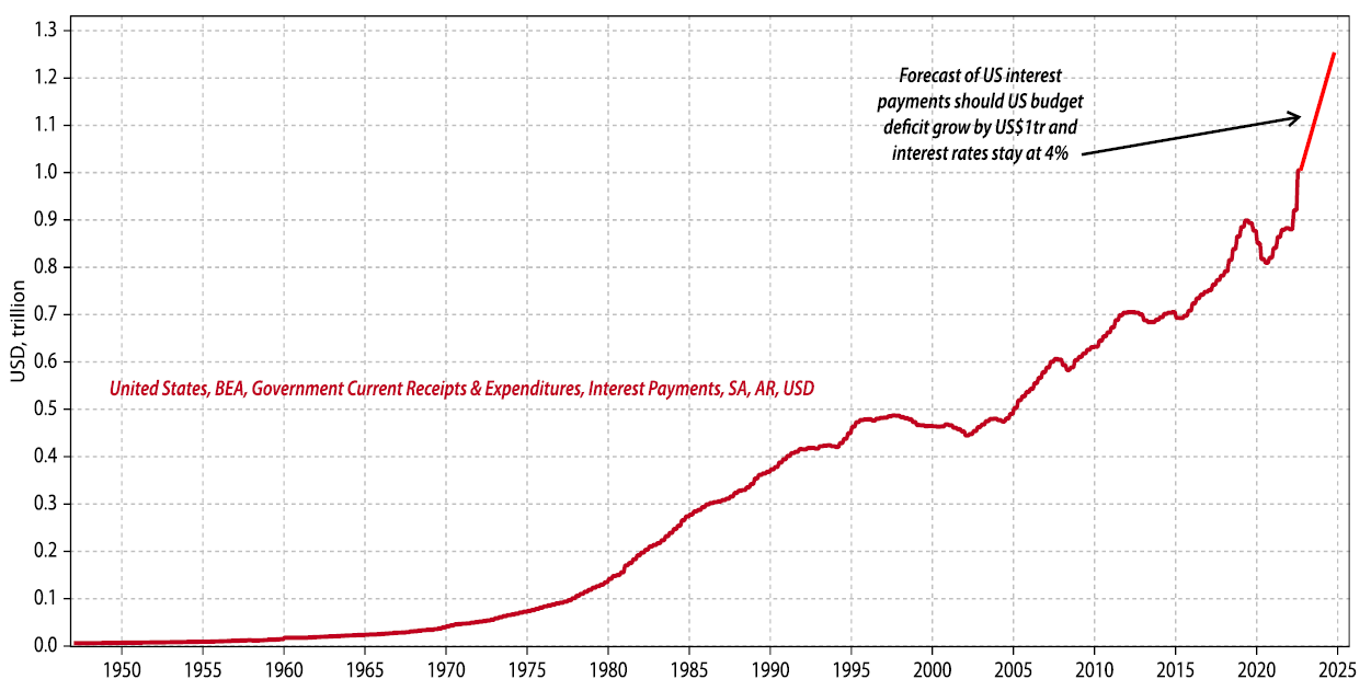 Inopportunely, the drying out of US Treasury buyers coincides with a US Treasury large issuance window. The US need to roll over half of its debt stock over the next two and a half years and given the trend in US rates, debt servicing is expected to grow by 10Bn USD per month over that same period. Given the shadow FED mandate of financial stability, (guaranteeing the government remains funded), debt monetization looks increasingly likely.